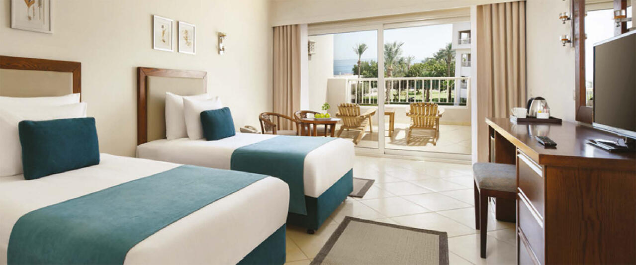 Die über 300 Zimmer haben je einen Balkon oder eine Terrasse und einen Blick auf das Meer, den Pool oder Garten. Sie verfügen außerdem über eine Klimaanlage, einen Fernseher, Tee- und Kaffeezubehör, einen Safe, eine begehbare Dusche und einen Föhn.